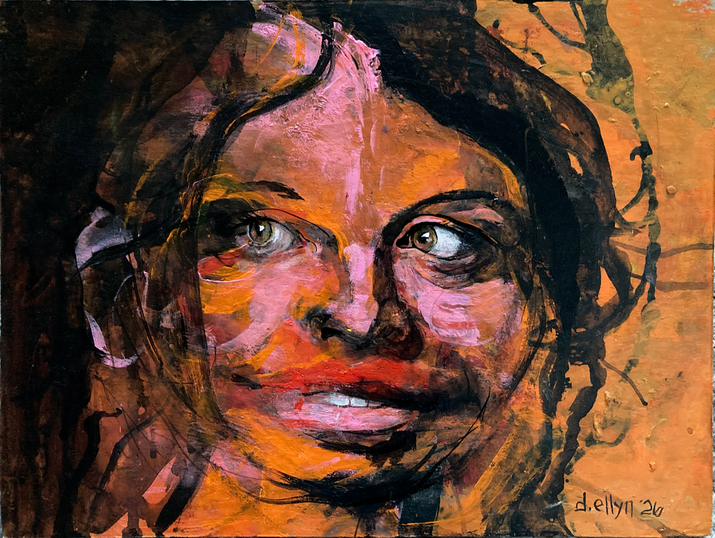 An unflinching face stares out from layers of amber and orange, pink highlights.