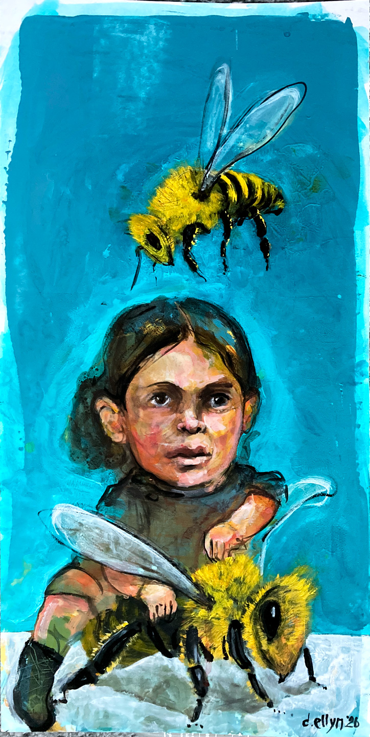 A small child sits unflinching between two enormous bees — one hovering overhead, and she sits astride the other. The scale reversal turns a familiar childhood fear into something tender and commanding.