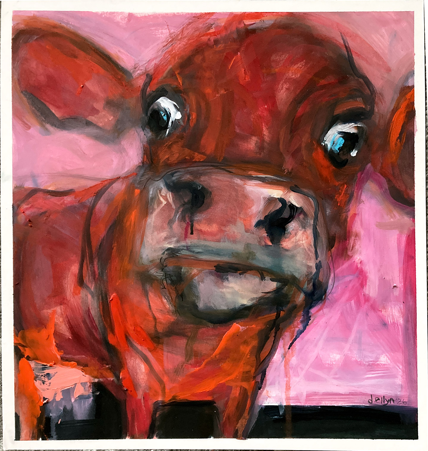 A red calf stares out with wide, searching eyes against vivid pink. The title carries weight — the red heifer holds deep significance across religious traditions and current geopolitical tensions, but here it's just an animal looking right at you, asking to be seen.