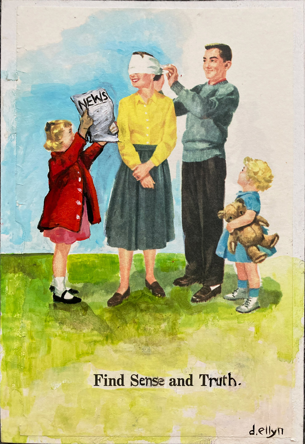 A woman blindfolded while a newspaper is held in front of her face — the text instructs the reader to "Find Sense and Truth." The truth is often hard to find.