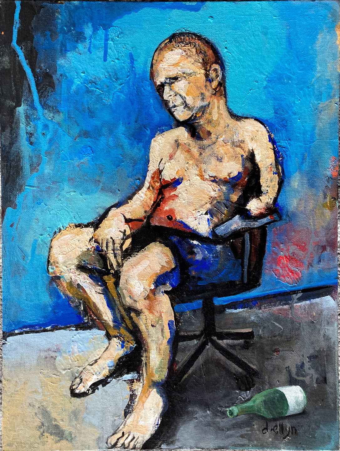 A stripped-down studio portrait of the artist's husband (and fellow artist), Matt Sesow. He figure sits slumped in the chair, a toppled empty wine bottle rests on the floor nearby.