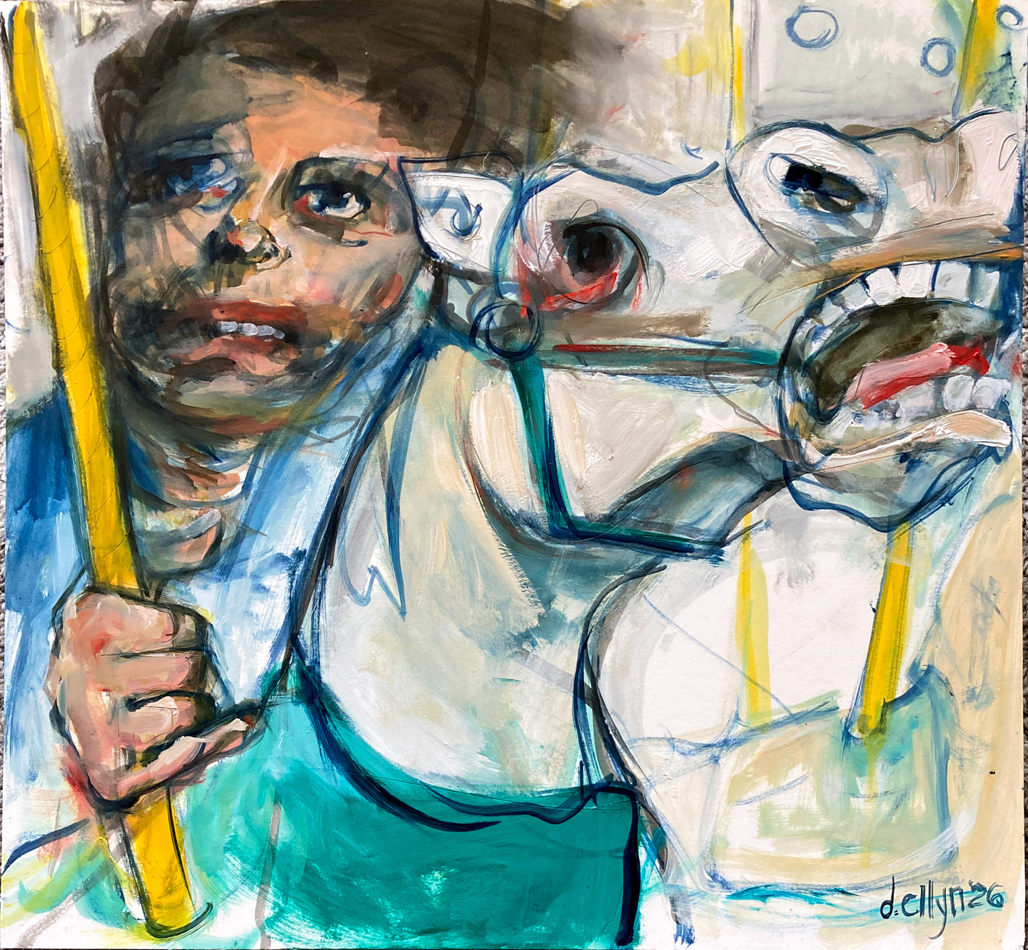 The second in the Worry-Go-Round series pushes even closer. A solemn, dark-haired child clutches the pole while a cartoon-wild carousel horse gapes open-mouthed beside them — their faces nearly merging.