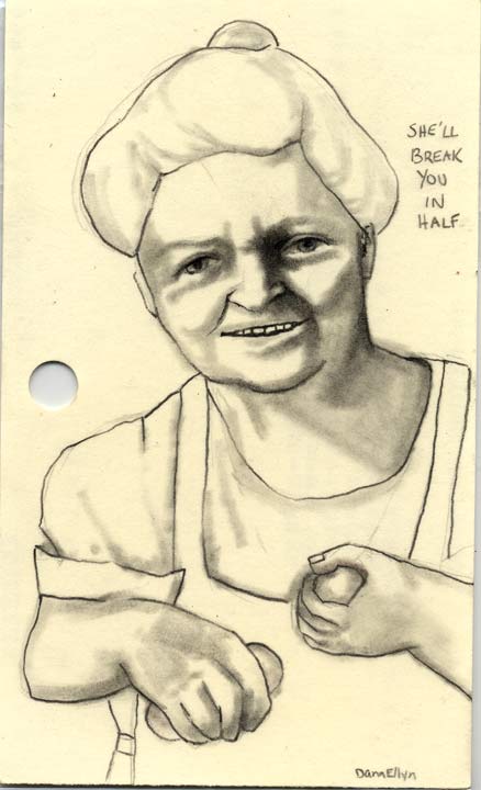 She'll Break You 3"x5" Pencil & ink on recycled library cards SOLD