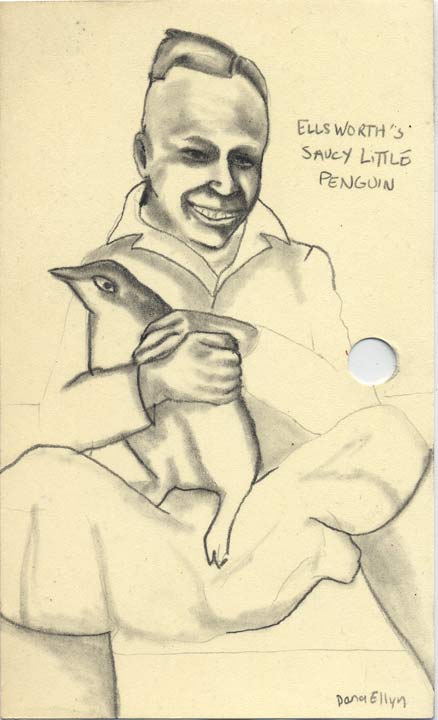 Saucy Little Penguin 3"x5" Pencil & ink on recycled library cards SOLD