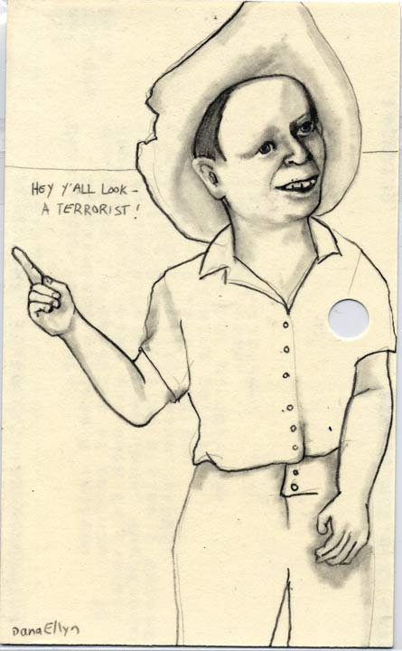 Hey Y'All Look - A Terrorist! 3"x5" Pencil & ink on recycled library cards SOLD