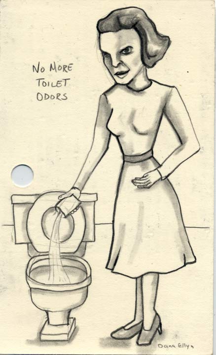 No More Toilet Odor 3"x5" Pencil & ink on recycled library cards SOLD