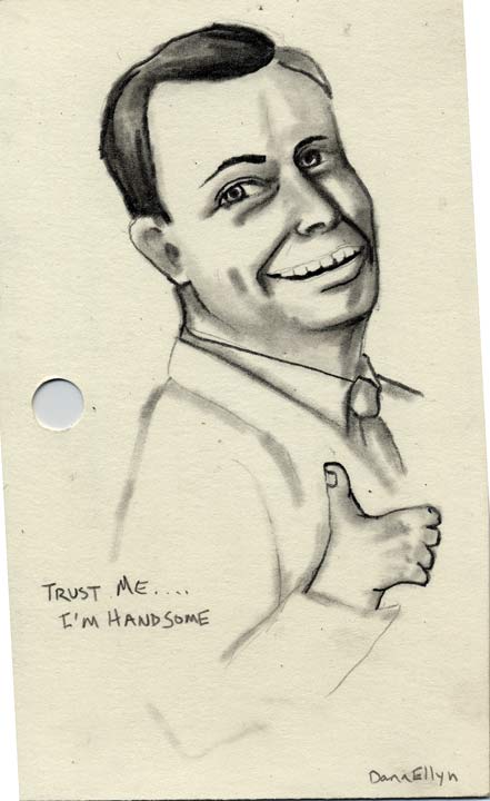 Trust Me, I'm Handsome 3"x5" Pencil & ink on recycled library cards SOLD