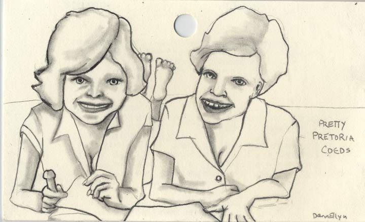Pretty Pretoria Coeds 3"x5" Pencil & ink on recycled library cards SOLD