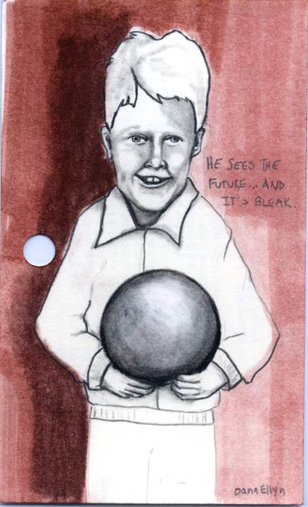 He Sees the Future... 3"x5" Pencil & ink on recycled library cards