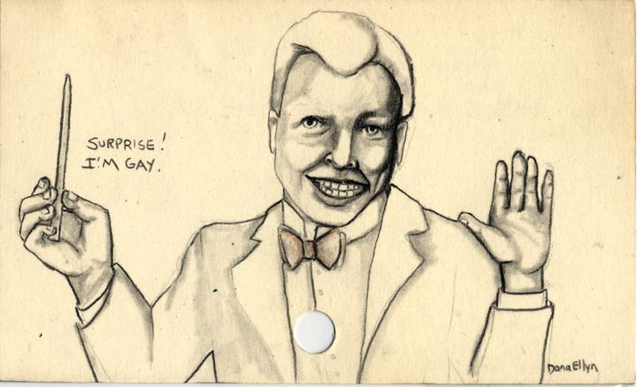 Surprise - I'm Gay! 3"x5" Pencil & ink on recycled library cards SOLD