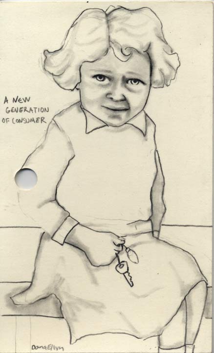 New Generation of Consumer 3"x5" Pencil & ink on recycled library cards SOLD