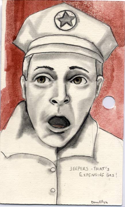 Jeepers Gas Is Expensive 3"x5" Pencil & ink on recycled library cards SOLD