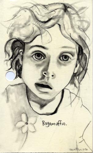 Ragamuffin 3"x5" Pencil on recycled library cards